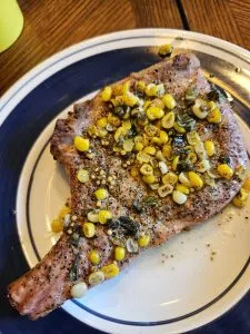Sometimes you just want to dress up your average chops without having to futz around with marinades, rubs, etc. Here’s a vinaigrette that you can just pour over some cooked pork chops that add BIG flavor without adding a lot of time.